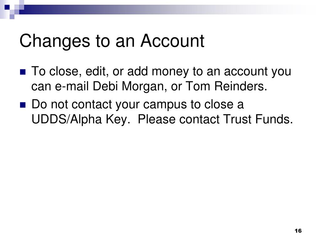 Changes to an Account • To close, edit, or add money to an account you can e-mail Debi Morgan, or Tom Reinders. • Do not contact your campus to close a UDDS/Alpha Key. Please contact Trust Funds.