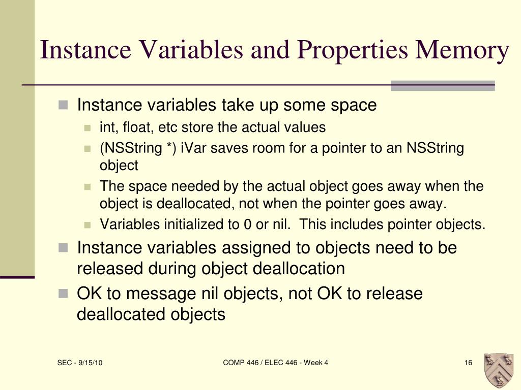 Instance Variables and Properties Memory • Instance variables take up some space • int, float, etc store the actual values • (NSString *) iVar saves room for a pointer to an NSString object • The space needed by the actual object goes away when the object is deallocated, not when the pointer goes away. • Variables initialized to 0 or nil. This includes pointer objects. • Instance variables assigned to objects need to be released during object deallocation • OK to message nil objects, not OK to release deallocated objects COMP 446 / ELEC 446 - Week 4