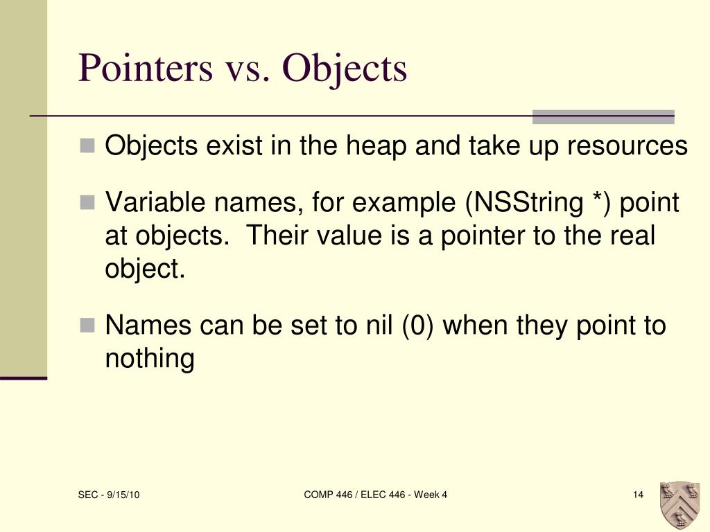 Pointers vs. Objects • Objects exist in the heap and take up resources • Variable names, for example (NSString *) point at objects. Their value is a pointer to the real object. • Names can be set to nil (0) when they point to nothing COMP 446 / ELEC 446 - Week 4