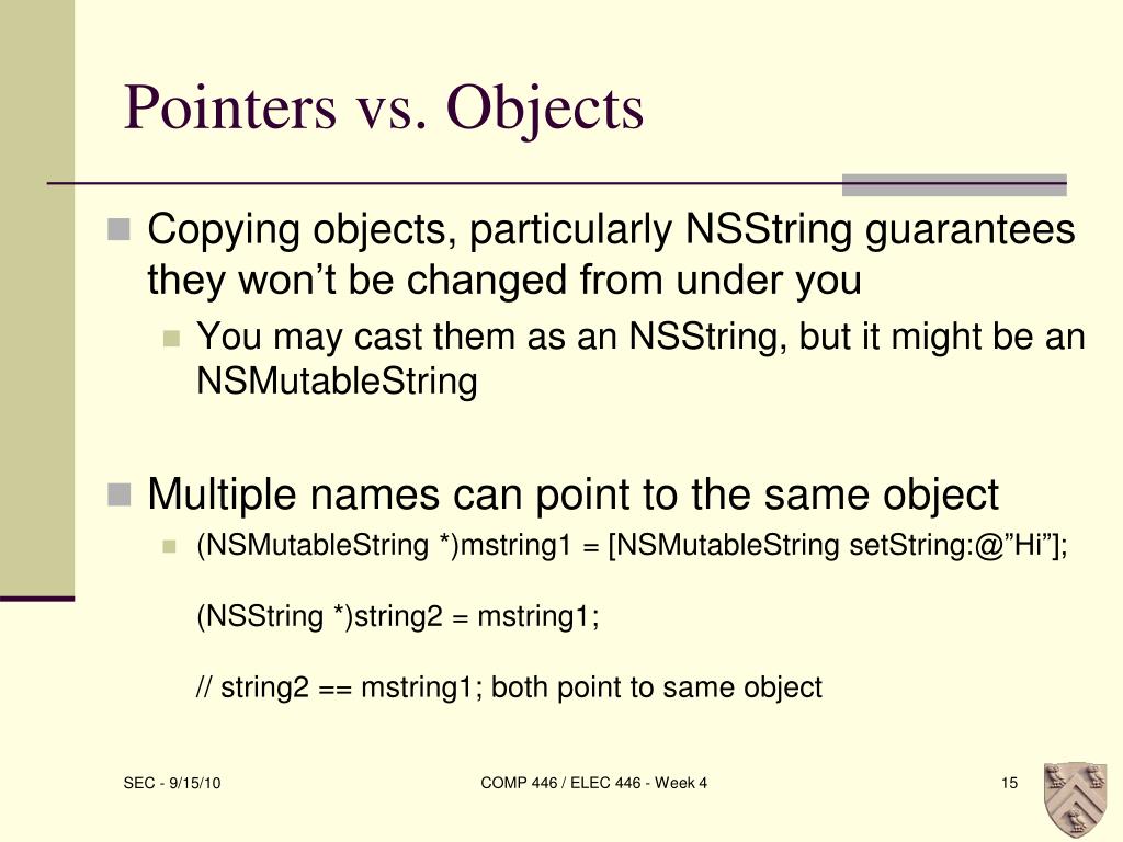 Pointers vs. Objects • Copying objects, particularly NSString guarantees they won’t be changed from under you • You may cast them as an NSString, but it might be an NSMutableString • Multiple names can point to the same object • (NSMutableString *)mstring1 = [NSMutableStringsetString:@”Hi”];(NSString *)string2 = mstring1; // string2 == mstring1; both point to same object COMP 446 / ELEC 446 - Week 4