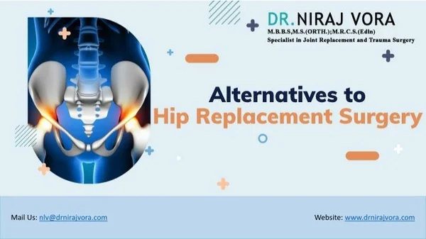 The non-surgical alternativesBefore opting for hip surgery, a doctor uses nonsurgical ways to ease the pain in your hips. The non-surgical alternatives to a hip replacement surgery are: • Change in lifestyle: The first alternative way to a hip replacement surgery is a lifestyle change. A person should lose weight, using a cane to walk so that it helps in putting the stress on the painful area of the hip and avoiding activities which might cause pain such as long walks or standing for a long time. • Use of anti-inflammatory medications: hip joint pain occurs due to the inflammation caused by hip arthritis. Inflammation can be reduced with the help of medication and this can delay hip replacement surgery. Doctors may prescribe Non-Steroidal Anti-Inflammatory Drugs (NSAIDs) to decrease the inflammation which is caused by arthritis. Cox-2 Inhibitors are a type of NSAID which is very effective in decreasing pain. Mail Us:nlv@drnirajvora.com Website: www.drnirajvora.com