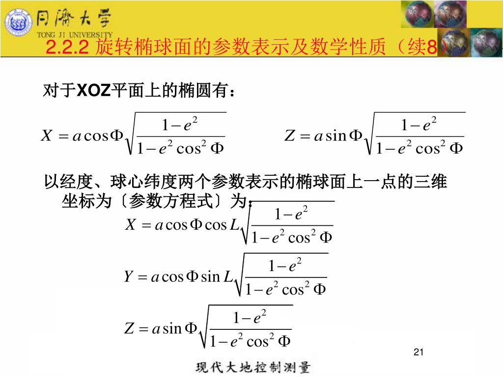 Z M 0 O X 2.2.2 旋转椭球面的参数表示及数学性质(续7) (3). 以大地经度L及球心纬度为参数的方程 球心纬度,向径,则对于 XOZ平面上的椭圆有: 在椭圆上,向径由球 心纬度唯一确定,将上式 代入椭圆方程,得: