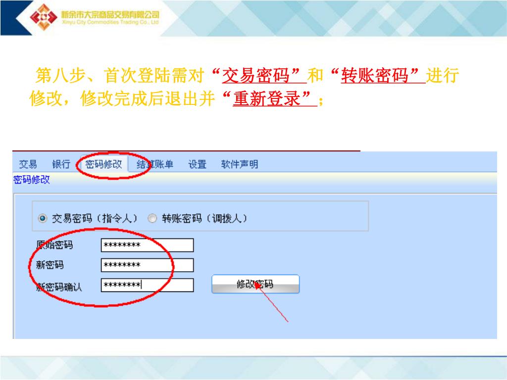 第八步、首次登陆需对“交易密码”和“转账密码”进行修改,修改完成后退出并“重新登录”;第八步、首次登陆需对“交易密码”和“转账密码”进行修改,修改完成后退出并“重新登录”;