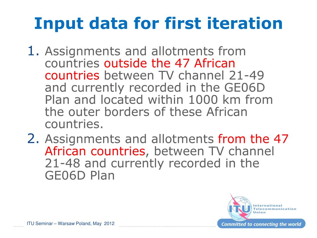 Input data for first iteration Assignments and allotments from countries outside the 47 African countries between TV channel 21-49 and currently recorded in the GE06D Plan and located within 1000 km from the outer borders of these African countries. Assignments and allotments from the 47 African countries, between TV channel 21-48 and currently recorded in the GE06D Plan