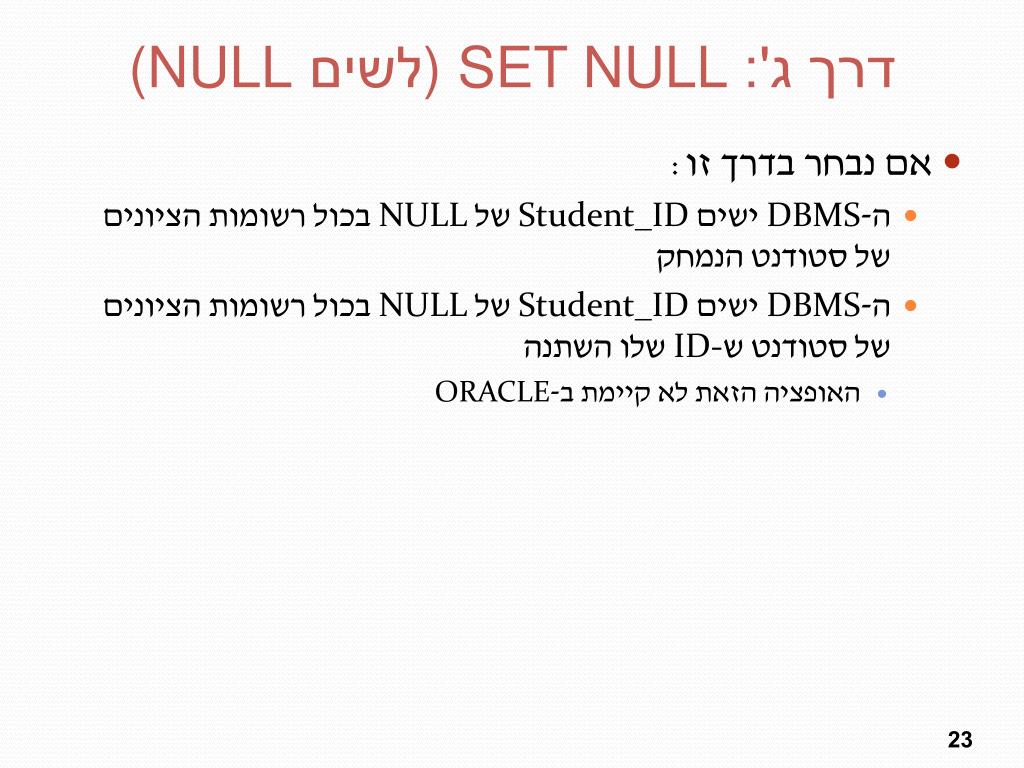 דרך ג': ) SET NULLלשים (NULL • אם נבחר בדרך זו: • ה-DBMS ישים Student_ID של NULL בכול רשומות הציונים של סטודנט הנמחק • ה-DBMS ישים Student_ID של NULL בכול רשומות הציונים של סטודנט שID- שלו השתנה • האופציה הזאת לא קיימת ב-ORACLE