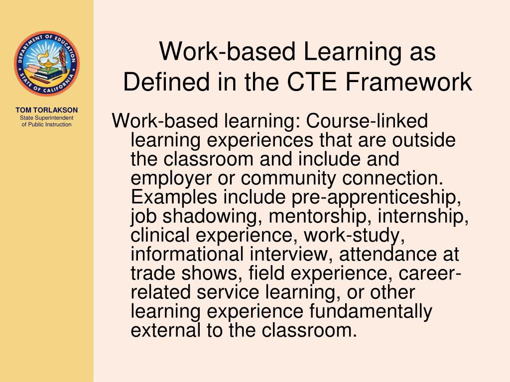Work-based Learning as Defined in the CTE Framework Work-based learning: Course-linked learning experiences that are outside the classroom and include and employer or community connection. Examples include pre-apprenticeship, job shadowing, mentorship, internship, clinical experience, work-study, informational interview, attendance at trade shows, field experience, career-related service learning, or other learning experience fundamentally external to the classroom.