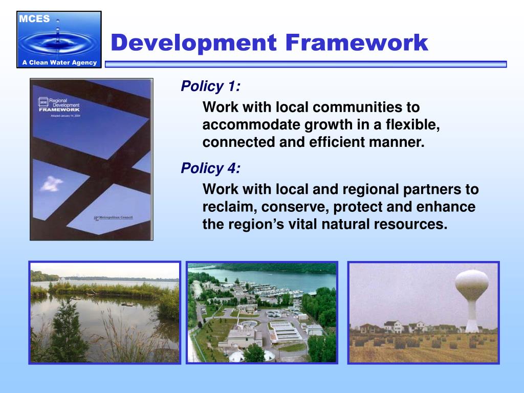 Development Framework Policy 1: Work with local communities to accommodate growth in a flexible, connected and efficient manner. Policy 4: Work with local and regional partners to reclaim, conserve, protect and enhance the region’s vital natural resources.