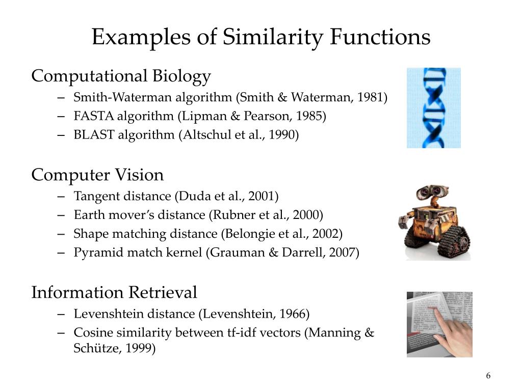 Examples of Similarity Functions Computational Biology • Smith-Waterman algorithm (Smith & Waterman, 1981) • FASTA algorithm (Lipman & Pearson, 1985) • BLAST algorithm (Altschul et al., 1990) Computer Vision • Tangent distance (Duda et al., 2001) • Earth mover’s distance (Rubner et al., 2000) • Shape matching distance (Belongie et al., 2002) • Pyramid match kernel (Grauman & Darrell, 2007) Information Retrieval • Levenshtein distance (Levenshtein, 1966) • Cosine similarity between tf-idf vectors (Manning & Schütze, 1999)