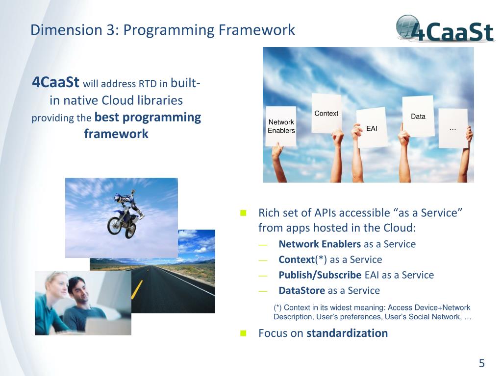 Dimension 3: Programming Framework 4CaaStwill address RTD in built-in native Cloud libraries providing the best programming framework Context Data Network Enablers … EAI • Rich set of APIs accessible “as a Service” from apps hosted in the Cloud: • Network Enablersas a Service • Context(*) as a Service • Publish/Subscribe EAI as a Service • DataStore as a Service • (*) Context in its widest meaning: Access Device+Network Description, User’s preferences, User’s Social Network, … • Focus on standardization