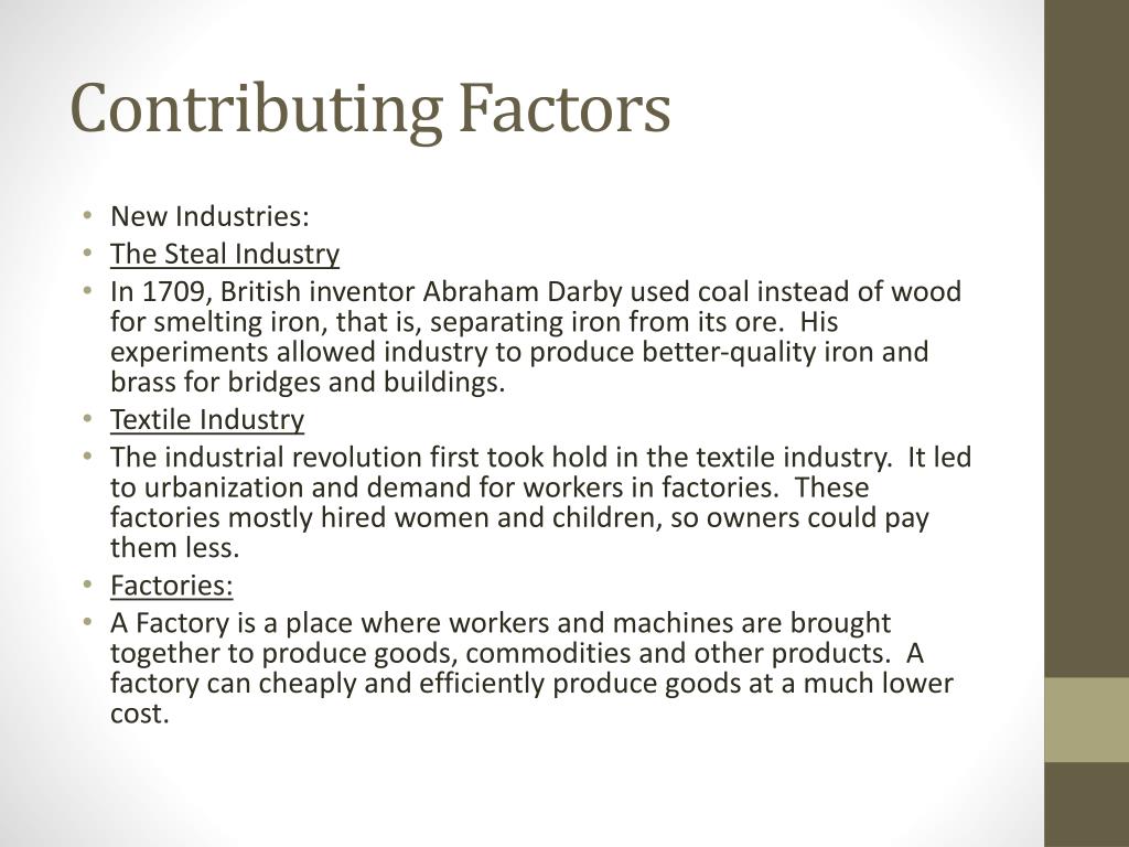 Contributing Factors • New Industries: • The Steal Industry • In 1709, British inventor Abraham Darby used coal instead of wood for smelting iron, that is, separating iron from its ore. His experiments allowed industry to produce better-quality iron and brass for bridges and buildings. • Textile Industry • The industrial revolution first took hold in the textile industry. It led to urbanization and demand for workers in factories. These factories mostly hired women and children, so owners could pay them less. • Factories: • A Factory is a place where workers and machines are brought together to produce goods, commodities and other products. A factory can cheaply and efficiently produce goods at a much lower cost.