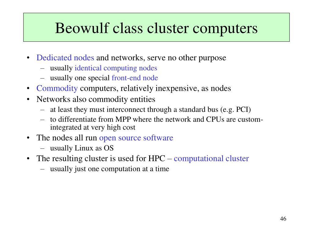 Beowulf class cluster computers • Dedicated nodes and networks, serve no other purpose • usually identical computing nodes • usually one special front-end node • Commodity computers, relatively inexpensive, as nodes • Networks also commodity entities • at least they must interconnect through a standard bus (e.g. PCI) • to differentiate from MPP where the network and CPUs are custom-integrated at very high cost • The nodes all run open source software • usually Linux as OS • The resulting cluster is used for HPC– computational cluster • usually just one computation at a time