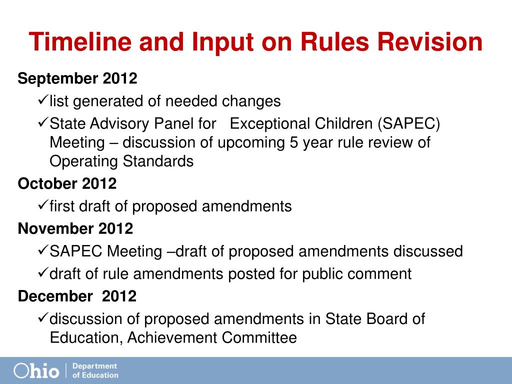 Timeline and Input on Rules Revision September 2012 • list generated of needed changes • State Advisory Panel for Exceptional Children (SAPEC) Meeting – discussion of upcoming 5 year rule review of Operating Standards October 2012 • first draft of proposed amendments November 2012 • SAPEC Meeting –draft of proposed amendments discussed • draft of rule amendments posted for public comment December 2012 • discussion of proposed amendments in State Board of Education, Achievement Committee