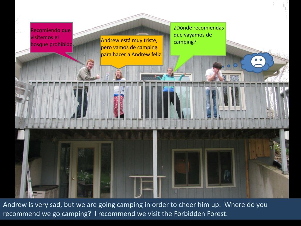¿Dónde recomiendas que vayamos de camping? • Recomiendo que visitemos el bosque prohibido. • Andrew está muy triste, • pero vamos de camping para hacer a Andrew feliz. Andrew is very sad, but we are going camping in order to cheer him up. Where do you recommend we go camping? I recommend we visit the Forbidden Forest.