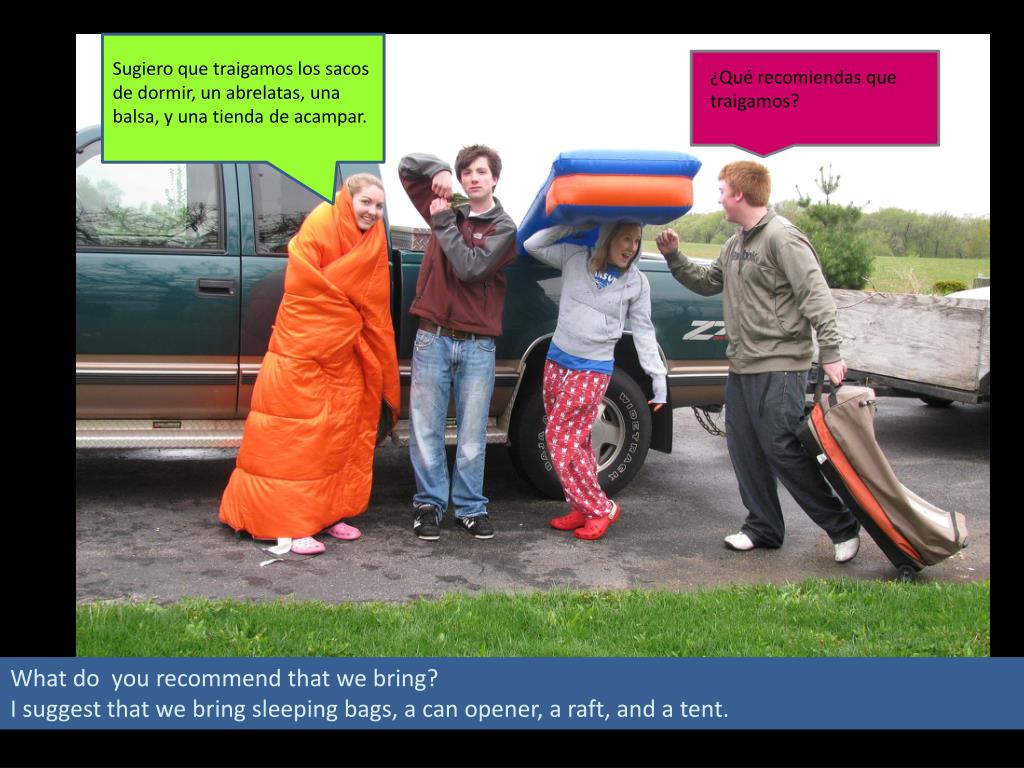 Sugiero que traigamos los sacos de dormir, un abrelatas, una balsa, y una tienda de acampar. • ¿Qué recomiendas que traigamos? What do you recommend that we bring? I suggest that we bring sleeping bags, a can opener, a raft, and a tent.