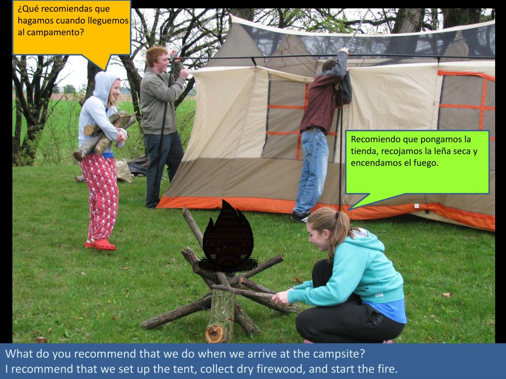 ¿Qué recomiendas que hagamos cuando lleguemos al campamento? • Recomiendo que pongamos la tienda, recojamos la leña seca y encendamos el fuego. What do you recommend that we do when we arrive at the campsite? I recommend that we set up the tent, collect dry firewood, and start the fire.