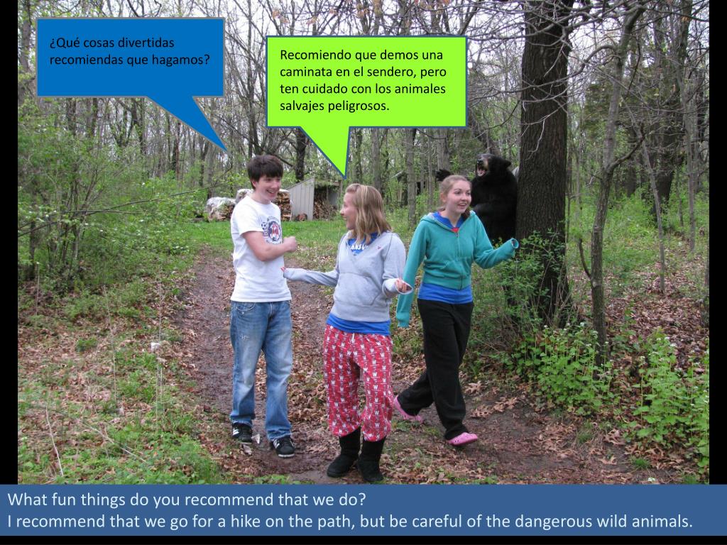 ¿Qué cosas divertidas recomiendas que hagamos? • Recomiendo que demos una caminata en el sendero, pero ten cuidado con los animales salvajes peligrosos. What fun things do you recommend that we do? I recommend that we go for a hike on the path, but be careful of the dangerous wild animals.