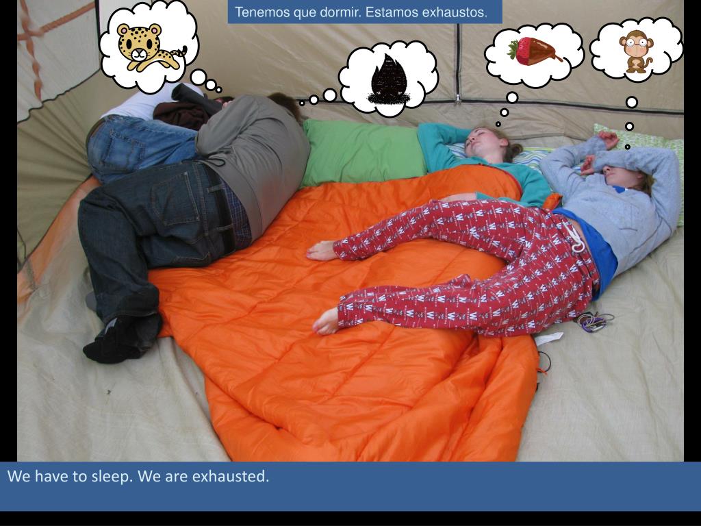 Tenemos que dormir. Estamos exhaustos. We have to sleep. We are exhausted.