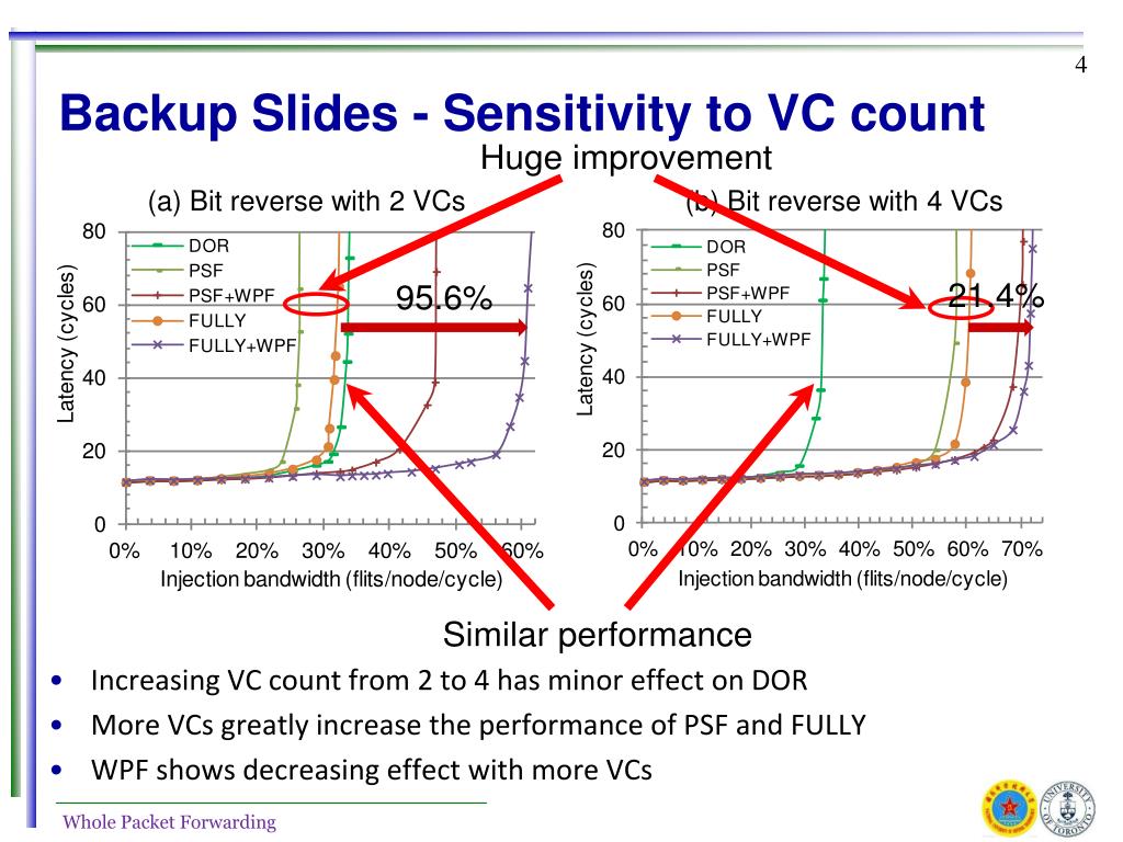 Backup Slides - Sensitivity to VC count • Increasing VC count from 2 to 4 has minor effect on DOR • More VCs greatly increase the performance of PSF and FULLY • WPF shows decreasing effect with more VCs (a) Bit reverse with 2 VCs (b) Bit reverse with 4 VCs