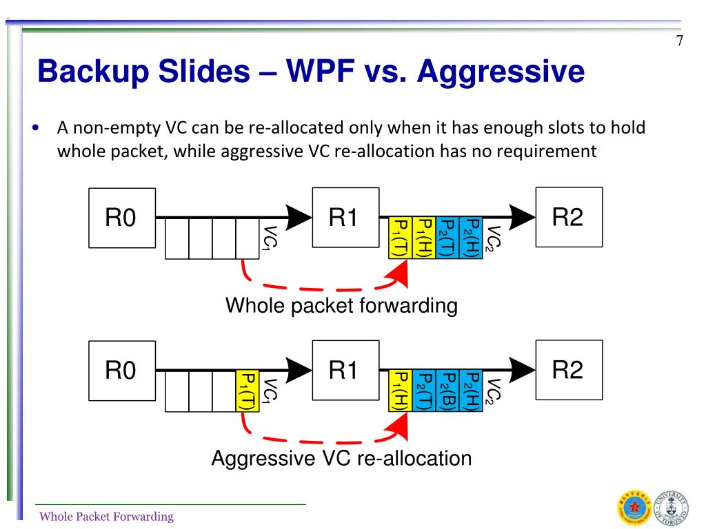 Backup Slides – WPF vs. Aggressive • A non-empty VC can be re-allocated only when it has enough slots to hold whole packet, while aggressive VC re-allocation has no requirement