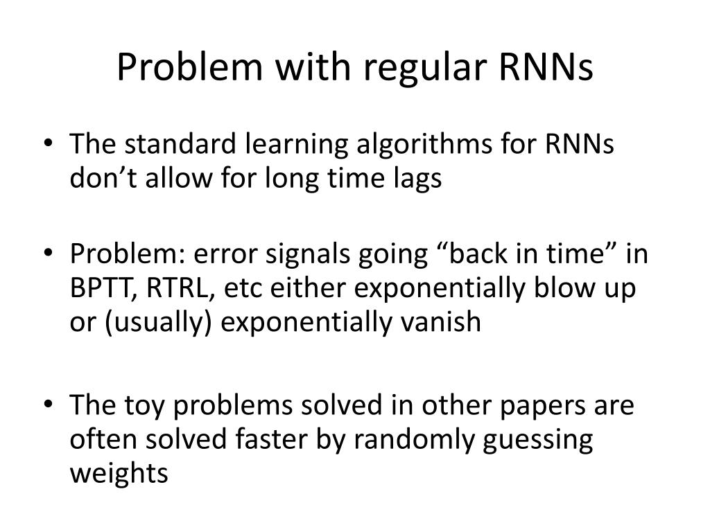 Dougal Sutherland, 9/25/13. Problem with regular RNNs. The standard learning algorithms for RNNs don’t allow for long time lags Problem: error signals going “back in time” in BPTT, RTRL, etc either exponentially blow up or (usually) exponentially vanish