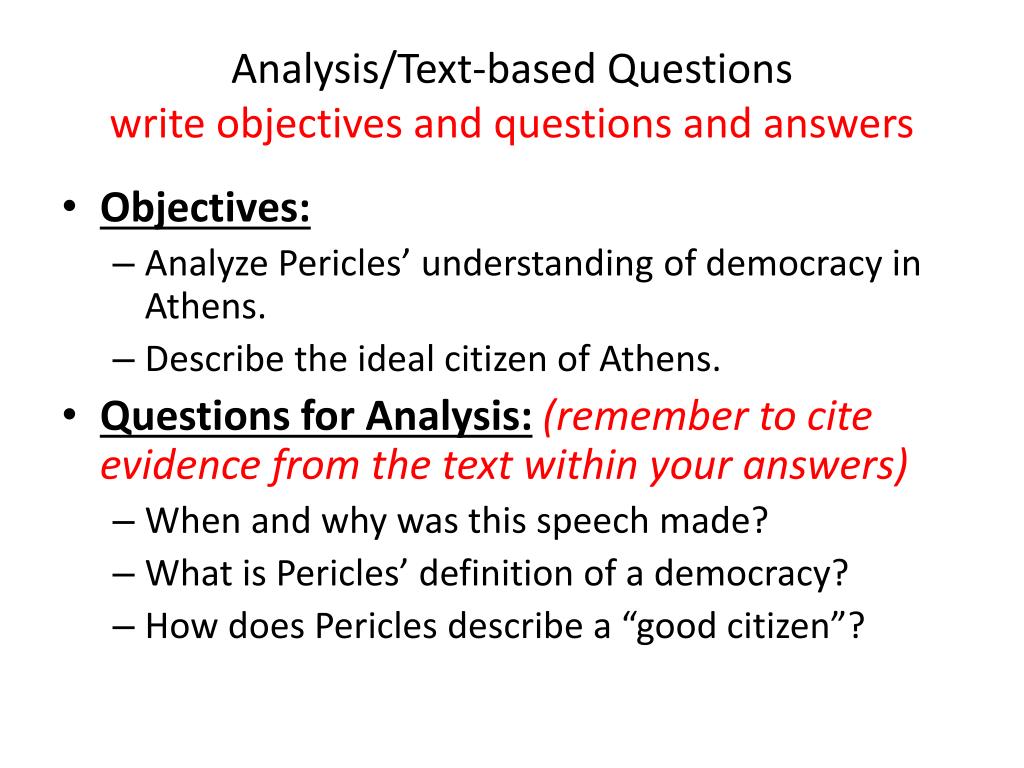 Analysis/Text-based Questionswrite objectives and questions and answers • Objectives: • Analyze Pericles’ understanding of democracy in Athens. • Describe the ideal citizen of Athens. • Questions for Analysis:(remember to cite evidence from the text within your answers) • When and why was this speech made? • What is Pericles’ definition of a democracy? • How does Pericles describe a “good citizen”?