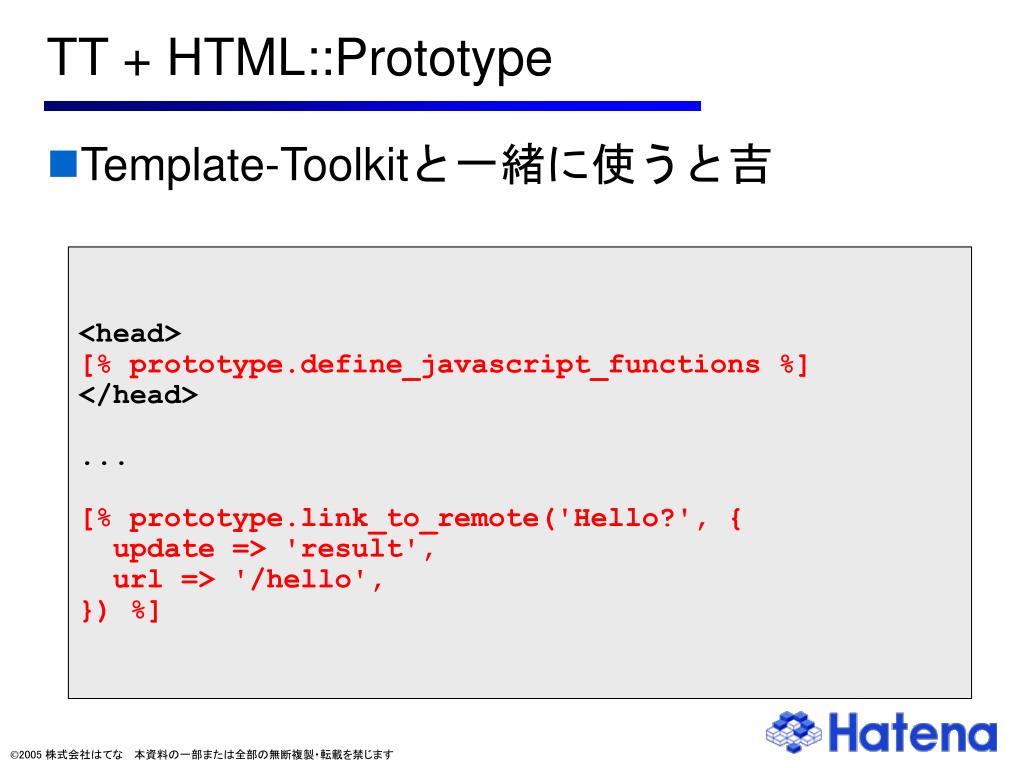 TT + HTML::Prototype • Template-Toolkitと一緒に使うと吉 <head> [% prototype.define_javascript_functions %] </head> ... [% prototype.link_to_remote('Hello?', { update => 'result', url => '/hello', }) %]