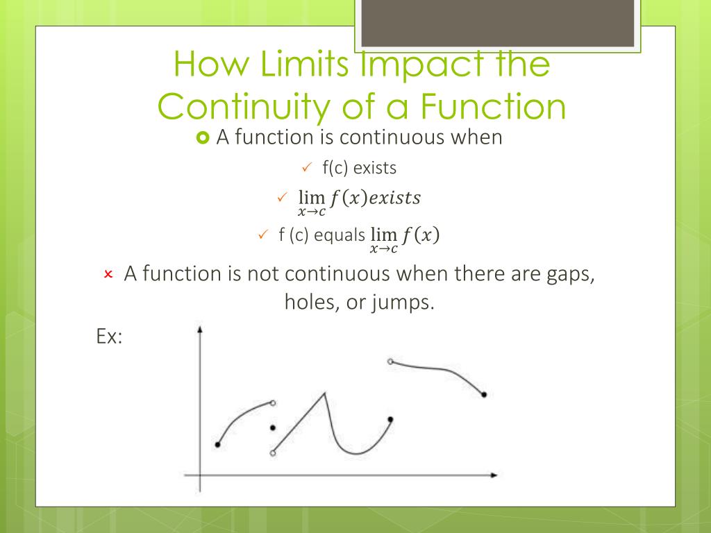 How Limits Impact the Continuity of a Function • A function is continuous when • f(c) exists • f (c) equals • A function is not continuous when there are gaps, holes, or jumps. Ex: