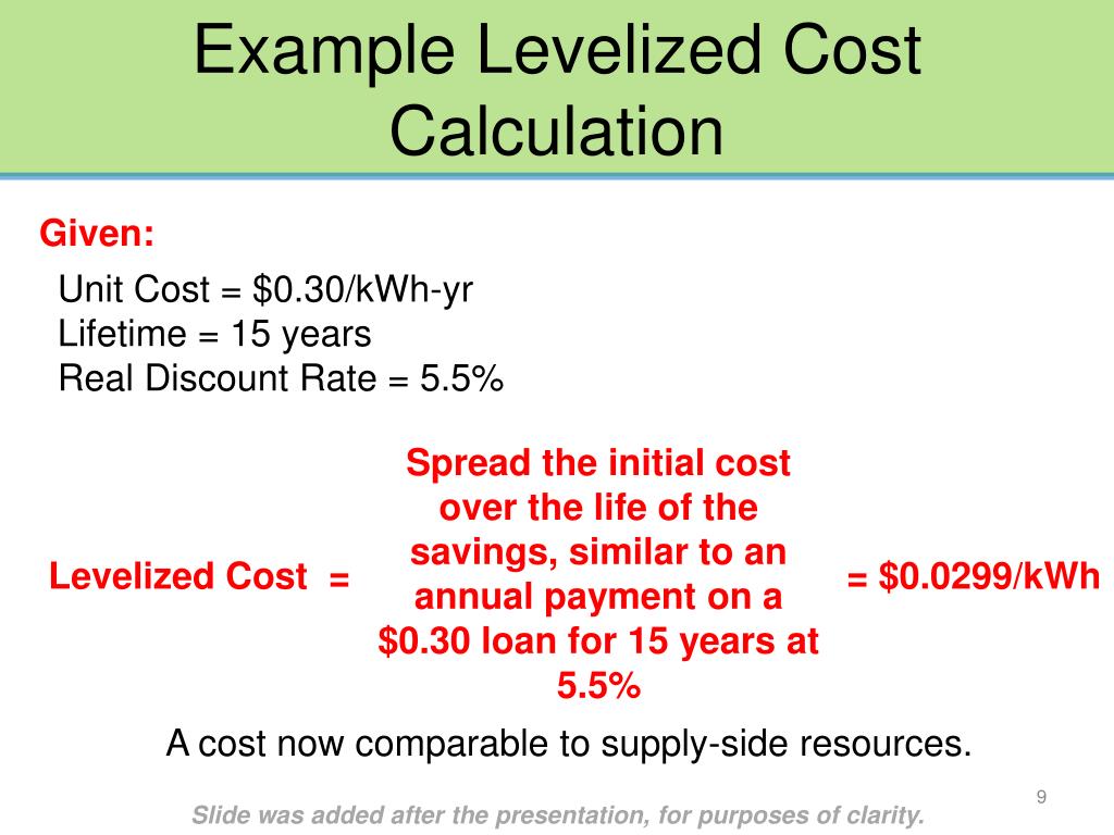 Example Levelized Cost Calculation Given: Unit Cost = $0.30/kWh-yr Lifetime = 15 years Real Discount Rate = 5.5% Spread the initial cost over the life of the savings, similar to an annual payment on a $0.30 loan for 15 years at 5.5% Levelized Cost = = $0.0299/kWh A cost now comparable to supply-side resources. Slide was added after the presentation, for purposes of clarity.