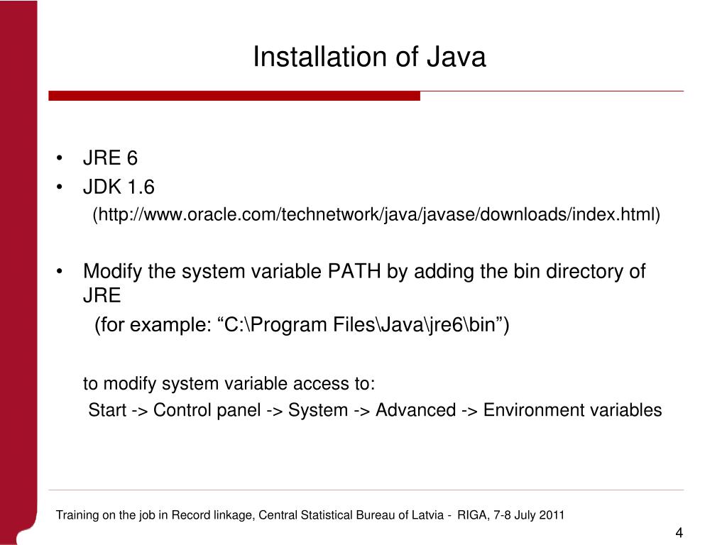 Installation of Java • JRE 6 • JDK 1.6 (http://www.oracle.com/technetwork/java/javase/downloads/index.html) • Modify the system variable PATH by adding the bin directory of JRE (for example: “C:\Program Files\Java\jre6\bin”) to modify system variable access to: Start -> Control panel -> System -> Advanced -> Environment variables Training on the job in Record linkage, Central Statistical Bureau of Latvia -RIGA, 7-8 July 2011
