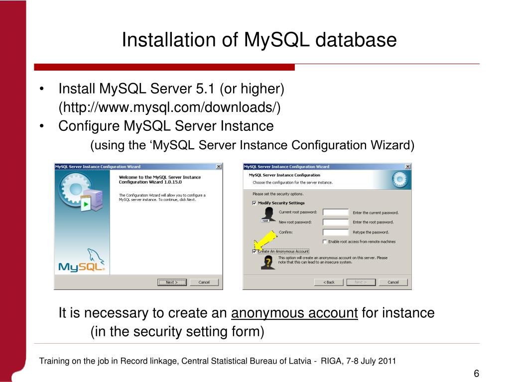 Installation of MySQL database • Install MySQL Server 5.1 (or higher) (http://www.mysql.com/downloads/) • Configure MySQL Server Instance (using the ‘MySQL Server Instance Configuration Wizard) It is necessary to create an anonymous account for instance (in the security setting form) Training on the job in Record linkage, Central Statistical Bureau of Latvia -RIGA, 7-8 July 2011