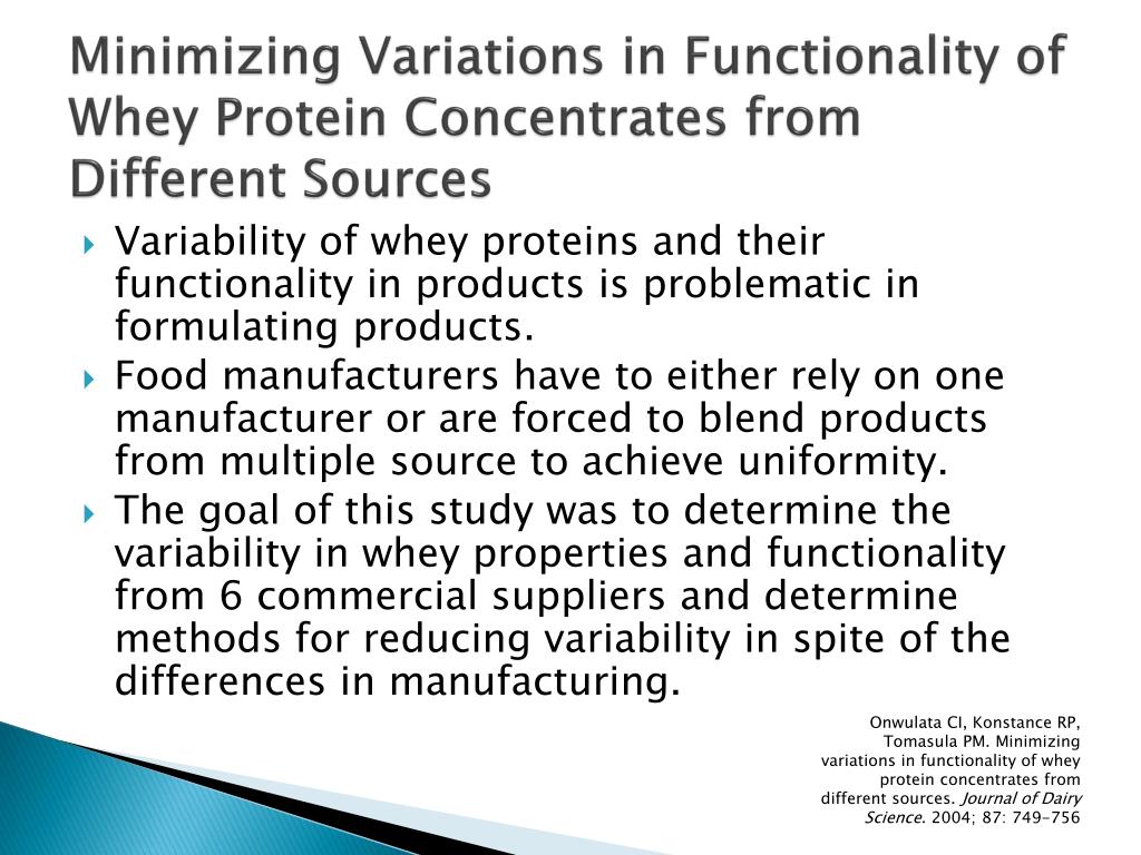 Minimizing Variations in Functionality of Whey Protein Concentrates from Different Sources • Variability of whey proteins and their functionality in products is problematic in formulating products. • Food manufacturers have to either rely on one manufacturer or are forced to blend products from multiple source to achieve uniformity. • The goal of this study was to determine the variability in whey properties and functionality from 6 commercial suppliers and determine methods for reducing variability in spite of the differences in manufacturing. Onwulata CI, Konstance RP, Tomasula PM. Minimizing variations in functionality of whey protein concentrates from different sources. Journal of Dairy Science. 2004; 87: 749-756