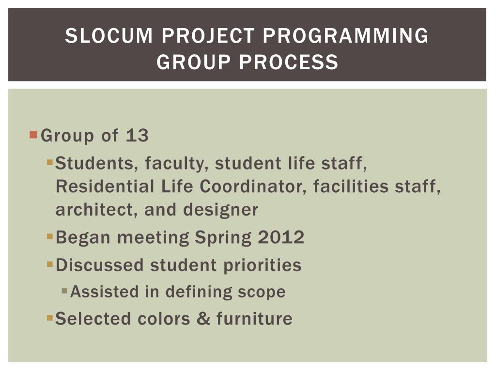 Slocum project Programming Group process • Group of 13 • Students, faculty, student life staff, Residential Life Coordinator, facilities staff, architect, and designer • Began meeting Spring 2012 • Discussed student priorities • Assisted in defining scope • Selected colors & furniture