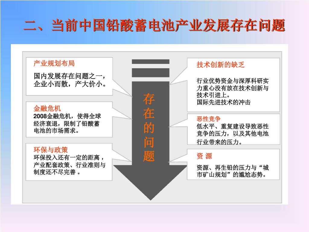 二、当前中国铅酸蓄电池产业发展存在问题 产业规划布局 国内发展存在问题之一,企业小而散,产大价小。 技术创新的缺乏 行业优势资金与深厚科研实力重心没有放在技术创新与技术引进上。 国际先进技术的冲击 存在的问题 金融危机 2008金融危机,使得全球经济衰退,限制了铅酸蓄电池的市场需求。 恶性竞争 低水平、重复建设导致恶性竞争的压力,以及其他电池行业带来的压力。 环保与政策 环保投入还有一定的距离 ,产业配套政策、行业准则与制度还不尽完善 。 资 源 资源、再生铅的压力与“城市矿山规划”的尴尬态势。