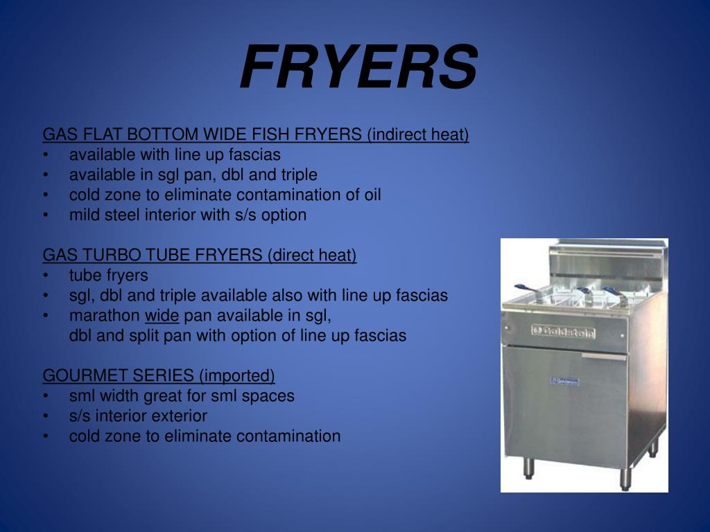 FRYERS GAS FLAT BOTTOM WIDE FISH FRYERS (indirect heat) • available with line up fascias • available in sgl pan, dbl and triple • cold zone to eliminate contamination of oil • mild steel interior with s/s option GAS TURBO TUBE FRYERS (direct heat) • tube fryers • sgl, dbl and triple available also with line up fascias • marathon wide pan available in sgl, dbl and split pan with option of line up fascias GOURMET SERIES (imported) • sml width great for sml spaces • s/s interior exterior • cold zone to eliminate contamination