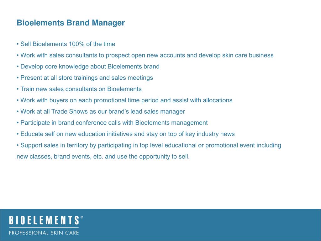 Bioelements Brand Manager • Sell Bioelements 100% of the time • Work with sales consultants to prospect open new accounts and develop skin care business • Develop core knowledge about Bioelements brand • Present at all store trainings and sales meetings • Train new sales consultants on Bioelements • Work with buyers on each promotional time period and assist with allocations • Work at all Trade Shows as our brand’s lead sales manager • Participate in brand conference calls with Bioelements management • Educate self on new education initiatives and stay on top of key industry news • Support sales in territory by participating in top level educational or promotional event including new classes, brand events, etc. and use the opportunity to sell.