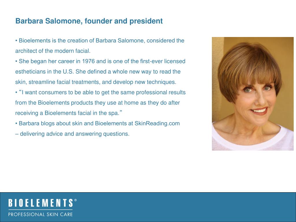 Barbara Salomone, founder and president • Bioelements is the creation of Barbara Salomone, considered the architect of the modern facial. • She began her career in 1976 and is one of the first-ever licensed estheticians in the U.S. She defined a whole new way to read the skin, streamline facial treatments, and develop new techniques. • “I want consumers to be able to get the same professional results from the Bioelements products they use at home as they do after receiving a Bioelements facial in the spa.” • Barbara blogs about skin and Bioelements at SkinReading.com – delivering advice and answering questions.