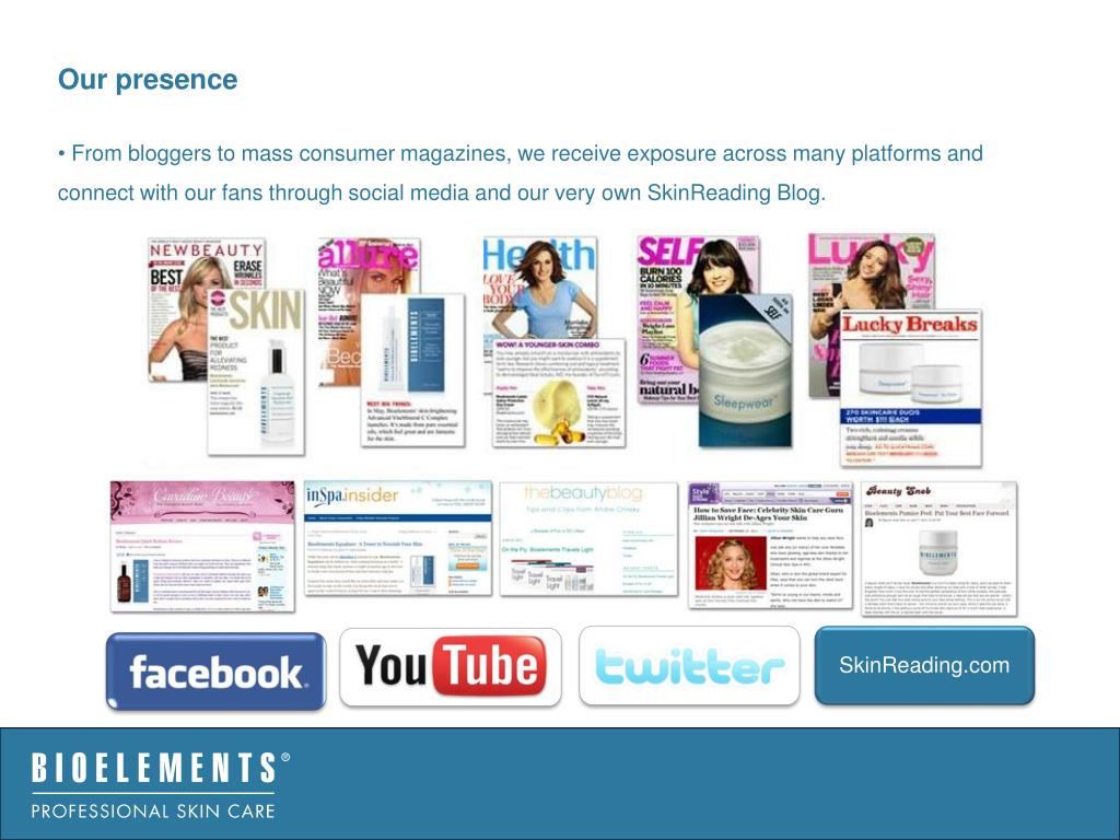 SkinReading.com Our presence • From bloggers to mass consumer magazines, we receive exposure across many platforms and connect with our fans through social media and our very own SkinReading Blog.