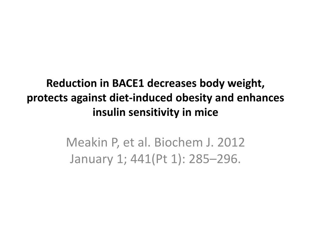 Reduction in BACE1 decreases body weight, protects against diet-induced obesity and enhances insulin sensitivity in mice MeakinP, et al. Biochem J. 2012 January 1; 441(Pt 1): 285–296.