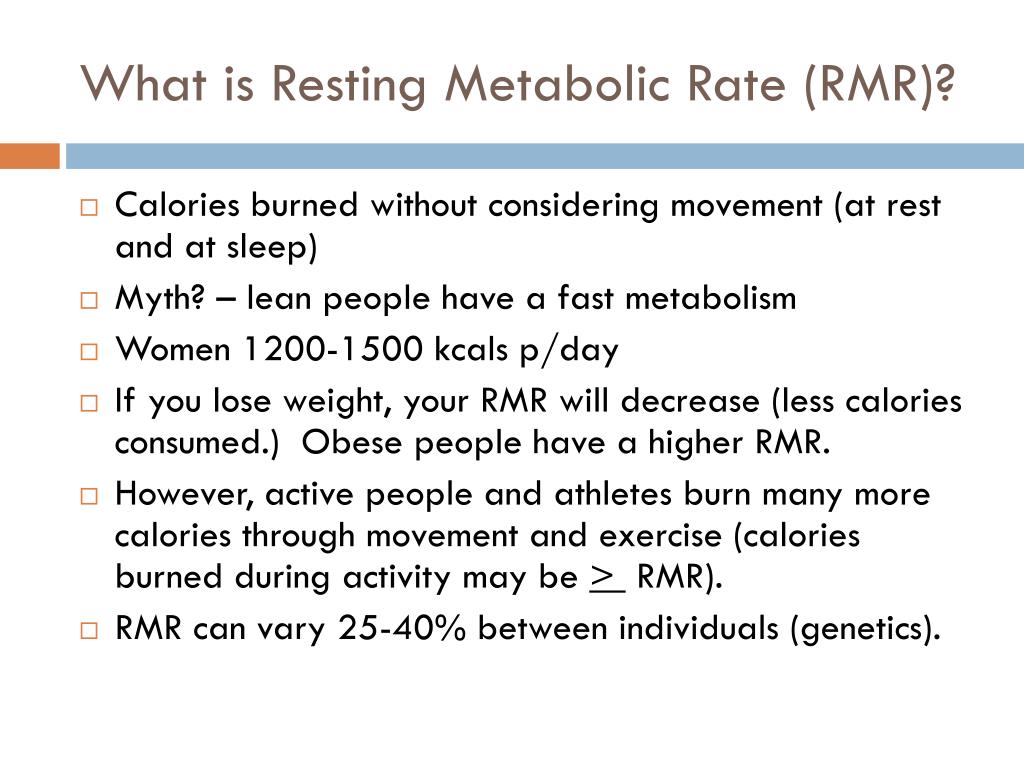 What is Resting Metabolic Rate (RMR)? • Calories burned without considering movement (at rest and at sleep) • Myth? – lean people have a fast metabolism • Women 1200-1500 kcals p/day • If you lose weight, your RMR will decrease (less calories consumed.) Obese people have a higher RMR. • However, active people and athletes burn many more calories through movement and exercise (calories burned during activity may be > RMR). • RMR can vary 25-40% between individuals (genetics).