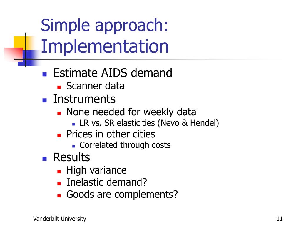 Simple approach: Implementation • Estimate AIDS demand • Scanner data • Instruments • None needed for weekly data • LR vs. SR elasticities (Nevo & Hendel) • Prices in other cities • Correlated through costs • Results • High variance • Inelastic demand? • Goods are complements?
