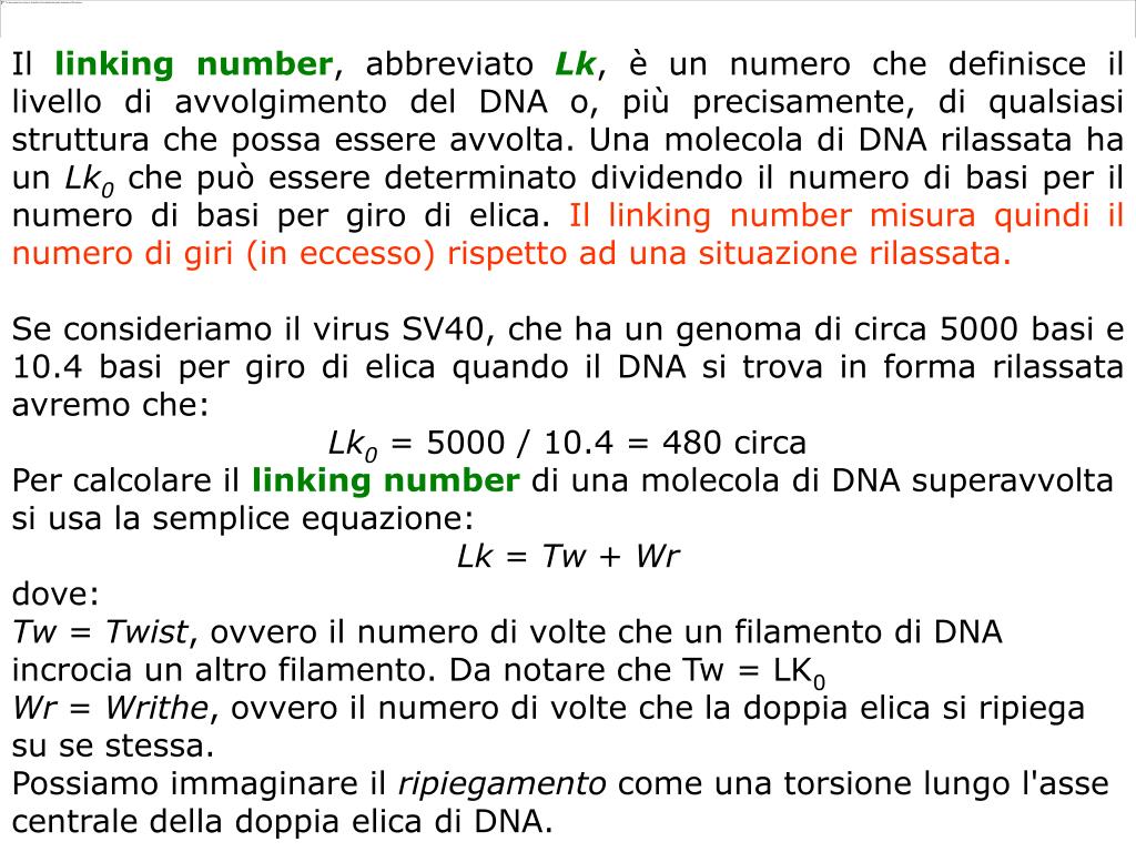 Il linking number, abbreviato Lk, è un numero che definisce il livello di avvolgimento del DNA o, più precisamente, di qualsiasi struttura che possa essere avvolta. Una molecola di DNA rilassata ha un Lk0che può essere determinato dividendo il numero di basi per il numero di basi per giro di elica. Illinking number misura quindi il numero di giri (in eccesso) rispetto ad una situazione rilassata. Se consideriamo il virus SV40, che ha un genoma di circa 5000 basi e 10.4 basi per giro di elica quando il DNA si trova in forma rilassata avremo che: Lk0 = 5000 / 10.4 = 480 circa Per calcolare il linking number di una molecola di DNA superavvolta si usa la semplice equazione: Lk = Tw + Wr dove: Tw = Twist, ovvero il numero di volte che un filamento di DNA incrocia un altro filamento. Da notare che Tw = LK0 Wr = Writhe, ovvero il numero di volte che la doppia elica si ripiega su se stessa. Possiamo immaginare il ripiegamento come una torsione lungo l'asse centrale della doppia elica di DNA.