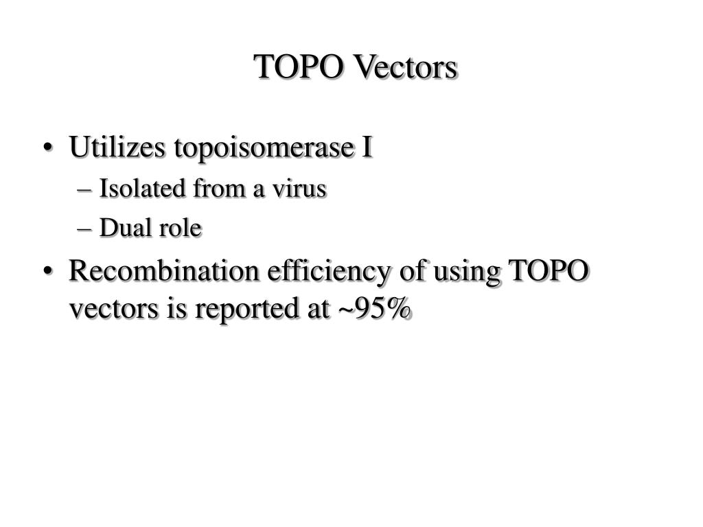 TOPO Vectors • Utilizes topoisomerase I • Isolated from a virus • Dual role • Recombination efficiency of using TOPO vectors is reported at ~95%
