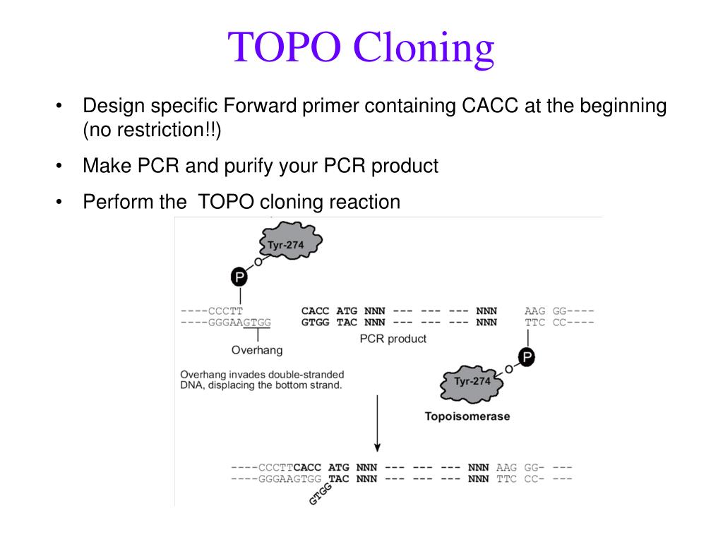 TOPO Cloning • Design specific Forward primer containing CACC at the beginning (no restriction!!) • Make PCR and purify your PCR product • Perform the TOPO cloning reaction