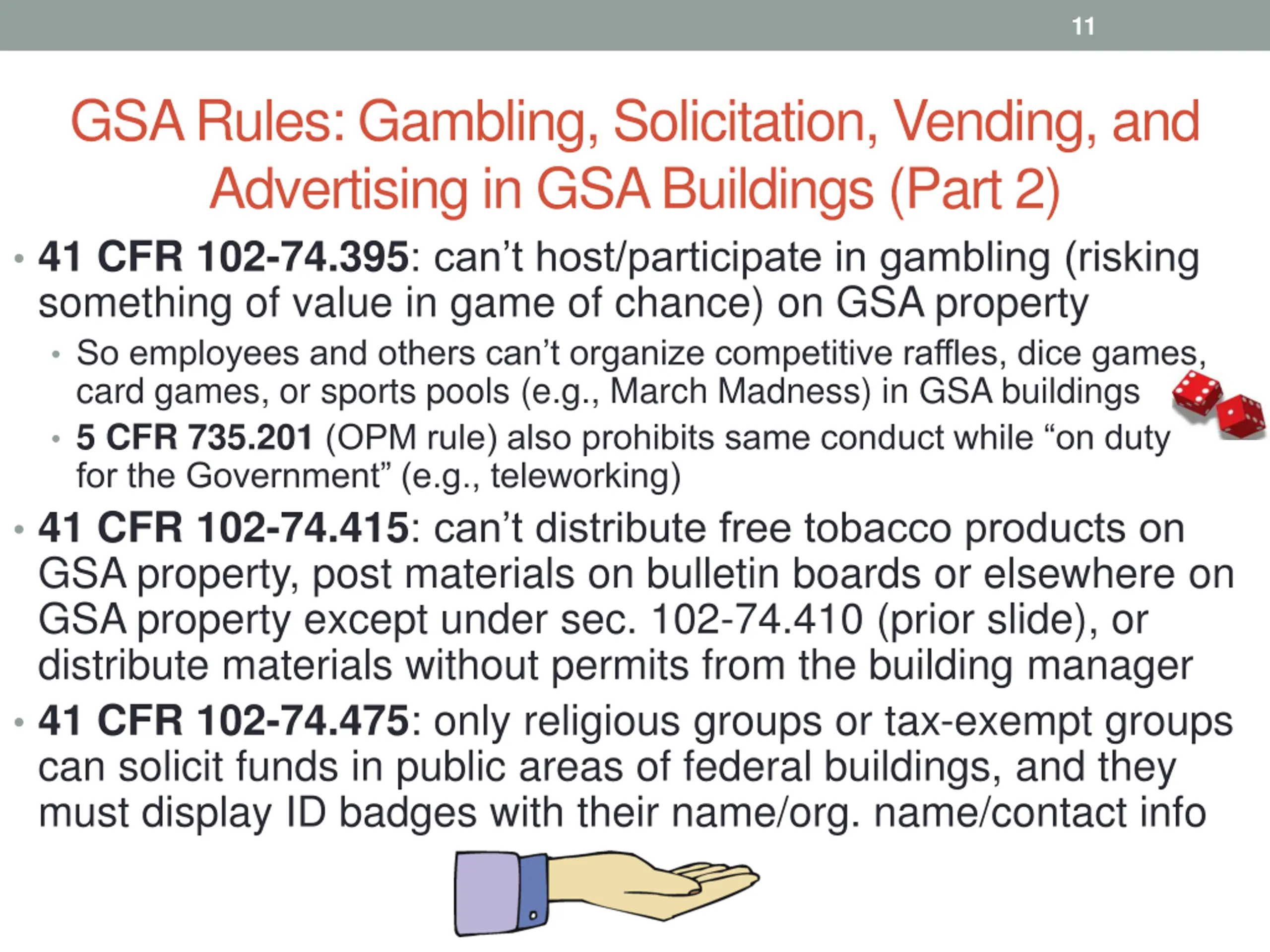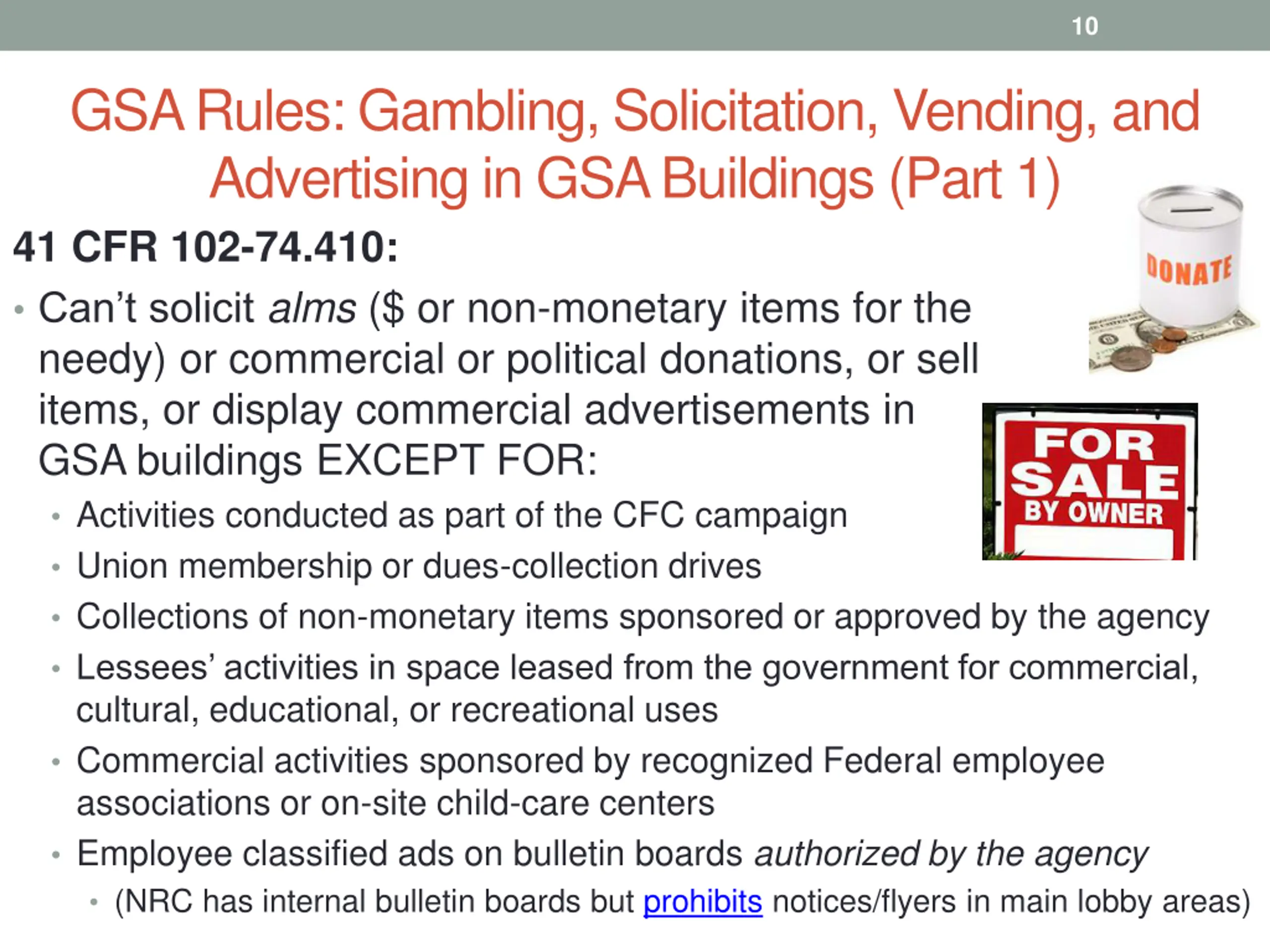 10 GSA Rules: Gambling, Solicitation, Vending, and Advertising in GSA Buildings (Part 1) 41 CFR 102-74.410: • Can’t solicit alms ($ or non-monetary items for the needy) or commercial or political donations, or sell items, or display commercial advertisements in GSA buildings EXCEPT FOR: • Activities conducted as part of the CFC campaign • Union membership or dues-collection drives • Collections of non-monetary items sponsored or approved by the agency • Lessees’ activities in space leased from the government for commercial, cultural, educational, or recreational uses • Commercial activities sponsored by recognized Federal employee associations or on-site child-care centers • Employee classified ads on bulletin boards authorized by the agency • (NRC has internal bulletin boards but prohibits notices/flyers in main lobby areas)