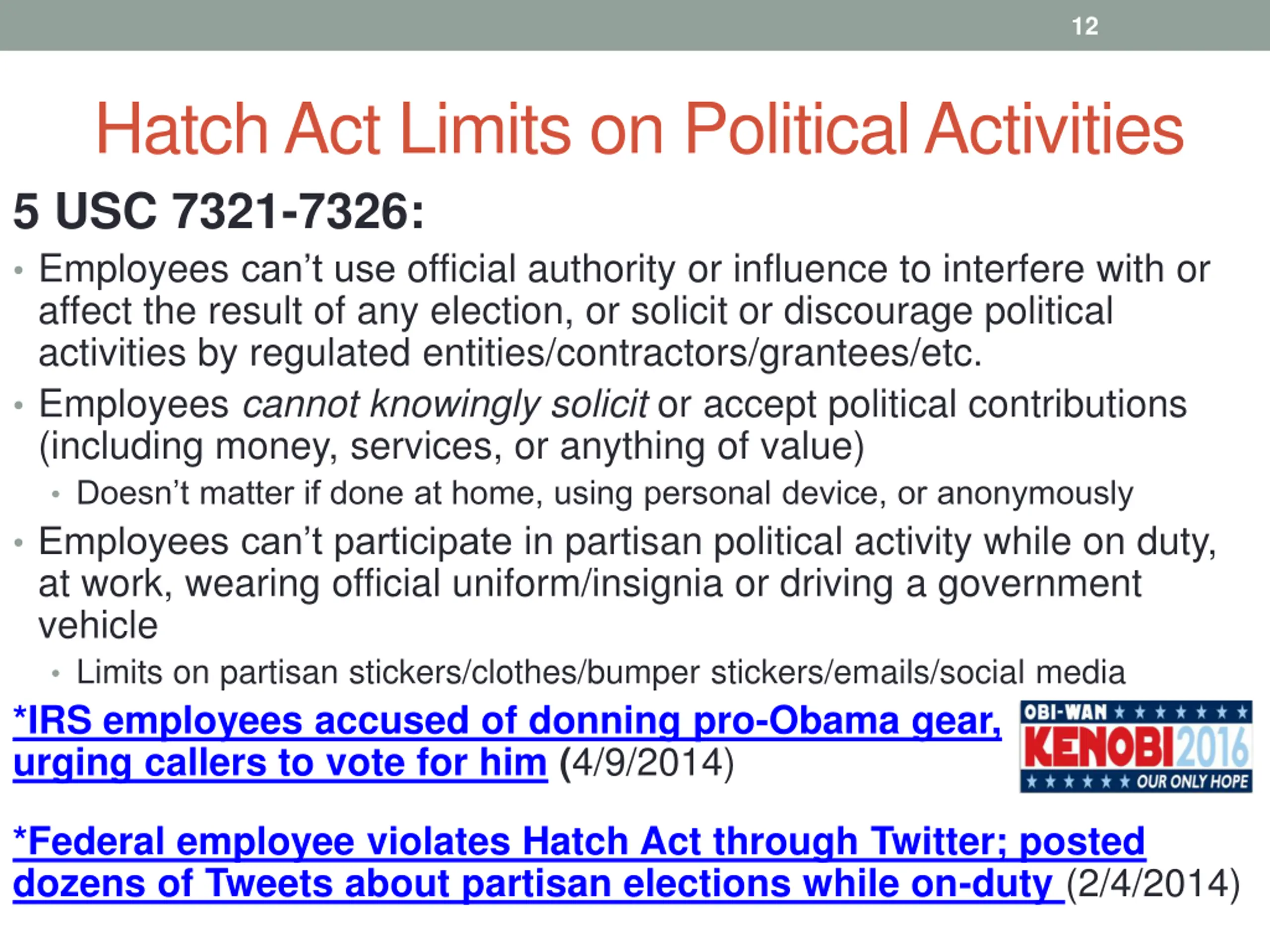 12 Hatch Act Limits on Political Activities 5 USC 7321-7326: • Employees can’t use official authority or influence to interfere with or affect the result of any election, or solicit or discourage political activities by regulated entities/contractors/grantees/etc. • Employees cannot knowingly solicit or accept political contributions (including money, services, or anything of value) • Doesn’t matter if done at home, using personal device, or anonymously • Employees can’t participate in partisan political activity while on duty, at work, wearing official uniform/insignia or driving a government vehicle • Limits on partisan stickers/clothes/bumper stickers/emails/social media *IRS employees accused of donning pro-Obama gear, urging callers to vote for him (4/9/2014) *Federal employee violates Hatch Act through Twitter; posted dozens of Tweets about partisan elections while on-duty (2/4/2014)