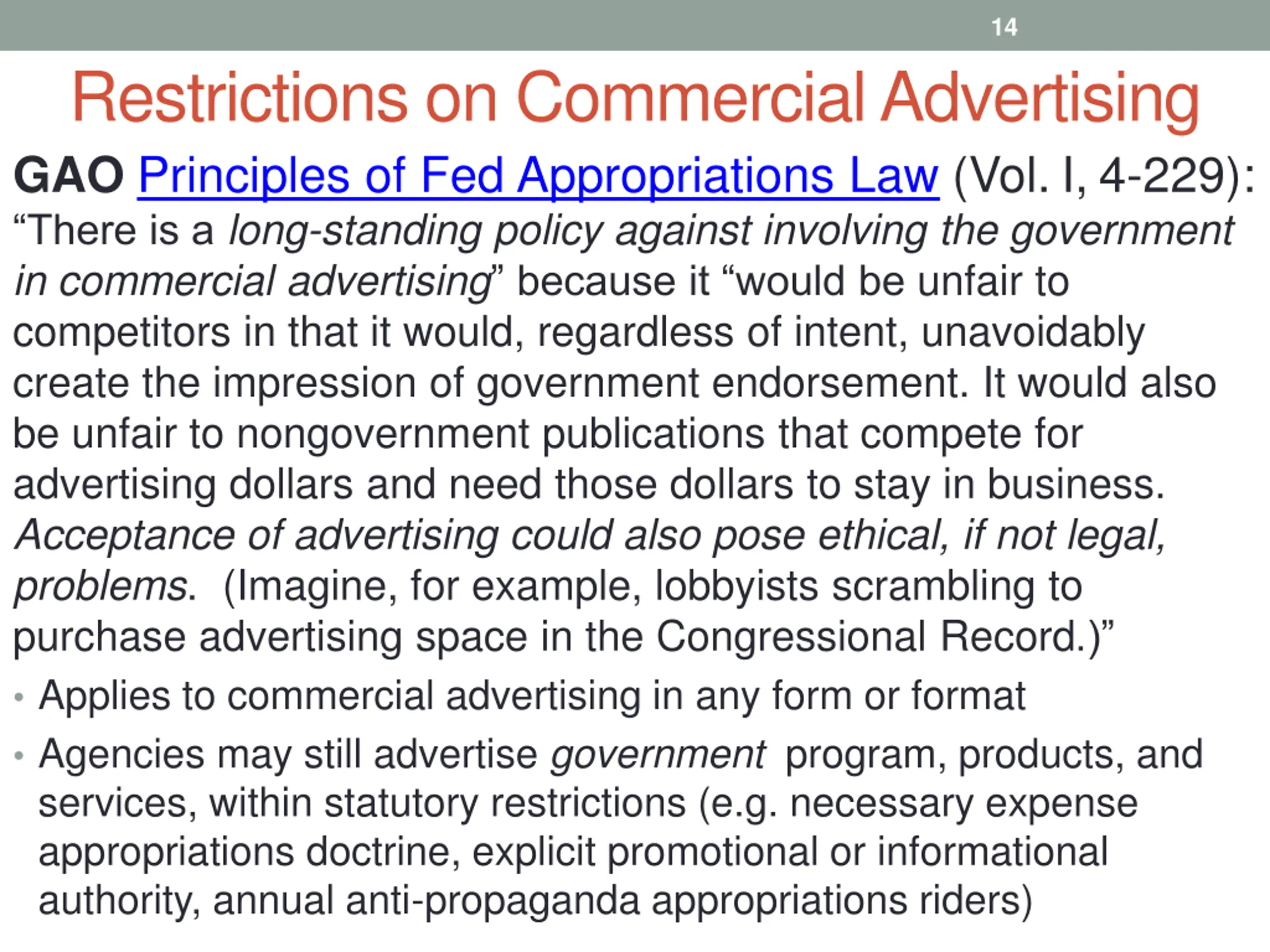 14 Restrictions on Commercial Advertising GAO Principles of Fed Appropriations Law (Vol. I, 4-229): “There is a long-standing policy against involving the government in commercial advertising” because it “would be unfair to competitors in that it would, regardless of intent, unavoidably create the impression of government endorsement. It would also be unfair to nongovernment publications that compete for advertising dollars and need those dollars to stay in business. Acceptance of advertising could also pose ethical, if not legal, problems. (Imagine, for example, lobbyists scrambling to purchase advertising space in the Congressional Record.)” • Applies to commercial advertising in any form or format • Agencies may still advertise government program, products, and services, within statutory restrictions (e.g. necessary expense appropriations doctrine, explicit promotional or informational authority, annual anti-propaganda appropriations riders)
