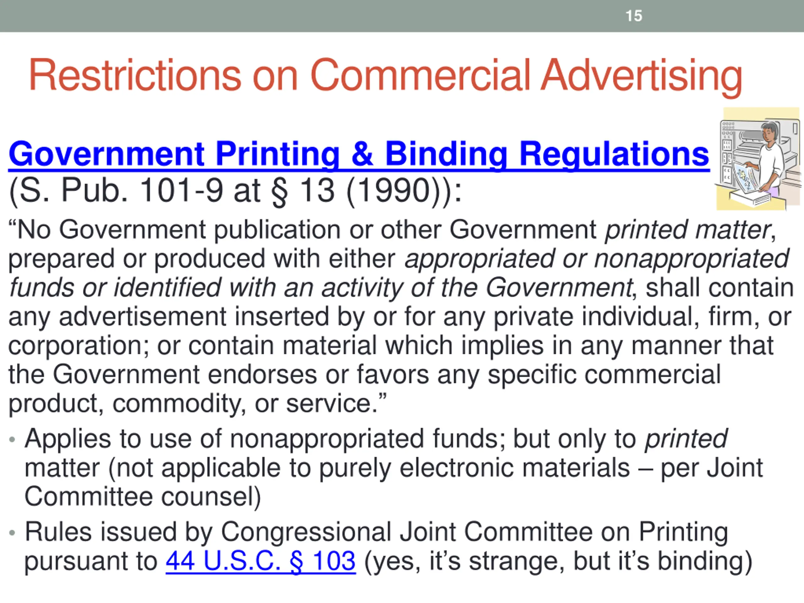 15 Restrictions on Commercial Advertising Government Printing & Binding Regulations (S. Pub. 101-9 at § 13 (1990)): “No Government publication or other Government printed matter, prepared or produced with either appropriated or nonappropriated funds or identified with an activity of the Government, shall contain any advertisement inserted by or for any private individual, firm, or corporation; or contain material which implies in any manner that the Government endorses or favors any specific commercial product, commodity, or service.” • Applies to use of nonappropriated funds; but only to printed matter (not applicable to purely electronic materials – per Joint Committee counsel) • Rules issued by Congressional Joint Committee on Printing pursuant to 44 U.S.C. § 103 (yes, it’s strange, but it’s binding)