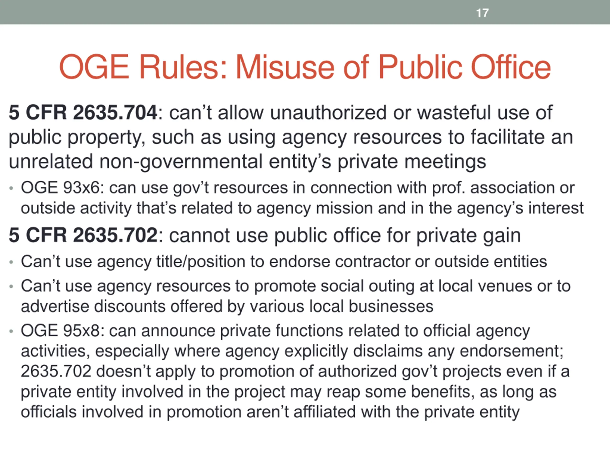 17 OGE Rules: Misuse of Public Office 5 CFR 2635.704: can’t allow unauthorized or wasteful use of public property, such as using agency resources to facilitate an unrelated non-governmental entity’s private meetings • OGE 93x6: can use gov’t resources in connection with prof. association or outside activity that’s related to agency mission and in the agency’s interest 5 CFR 2635.702: cannot use public office for private gain • Can’t use agency title/position to endorse contractor or outside entities • Can’t use agency resources to promote social outing at local venues or to advertise discounts offered by various local businesses • OGE 95x8: can announce private functions related to official agency activities, especially where agency explicitly disclaims any endorsement; 2635.702 doesn’t apply to promotion of authorized gov’t projects even if a private entity involved in the project may reap some benefits, as long as officials involved in promotion aren’t affiliated with the private entity