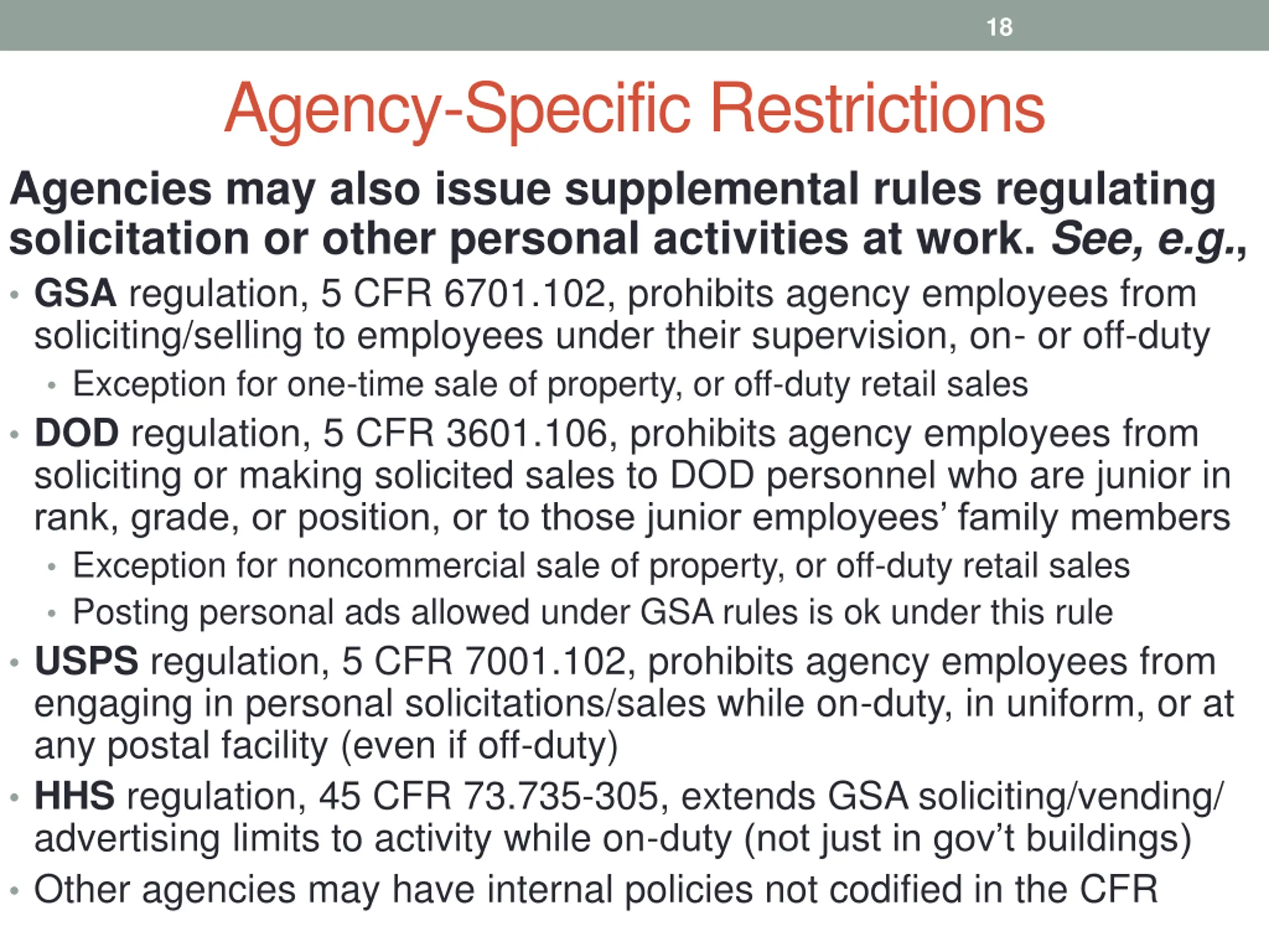 18 Agency-Specific Restrictions Agencies may also issue supplemental rules regulating solicitation or other personal activities at work. See, e.g., • GSA regulation, 5 CFR 6701.102, prohibits agency employees from soliciting/selling to employees under their supervision, on- or off-duty • Exception for one-time sale of property, or off-duty retail sales • DOD regulation, 5 CFR 3601.106, prohibits agency employees from soliciting or making solicited sales to DOD personnel who are junior in rank, grade, or position, or to those junior employees’ family members • Exception for noncommercial sale of property, or off-duty retail sales • Posting personal ads allowed under GSA rules is ok under this rule • USPS regulation, 5 CFR 7001.102, prohibits agency employees from engaging in personal solicitations/sales while on-duty, in uniform, or at any postal facility (even if off-duty) • HHS regulation, 45 CFR 73.735-305, extends GSA soliciting/vending/ advertising limits to activity while on-duty (not just in gov’t buildings) • Other agencies may have internal policies not codified in the CFR