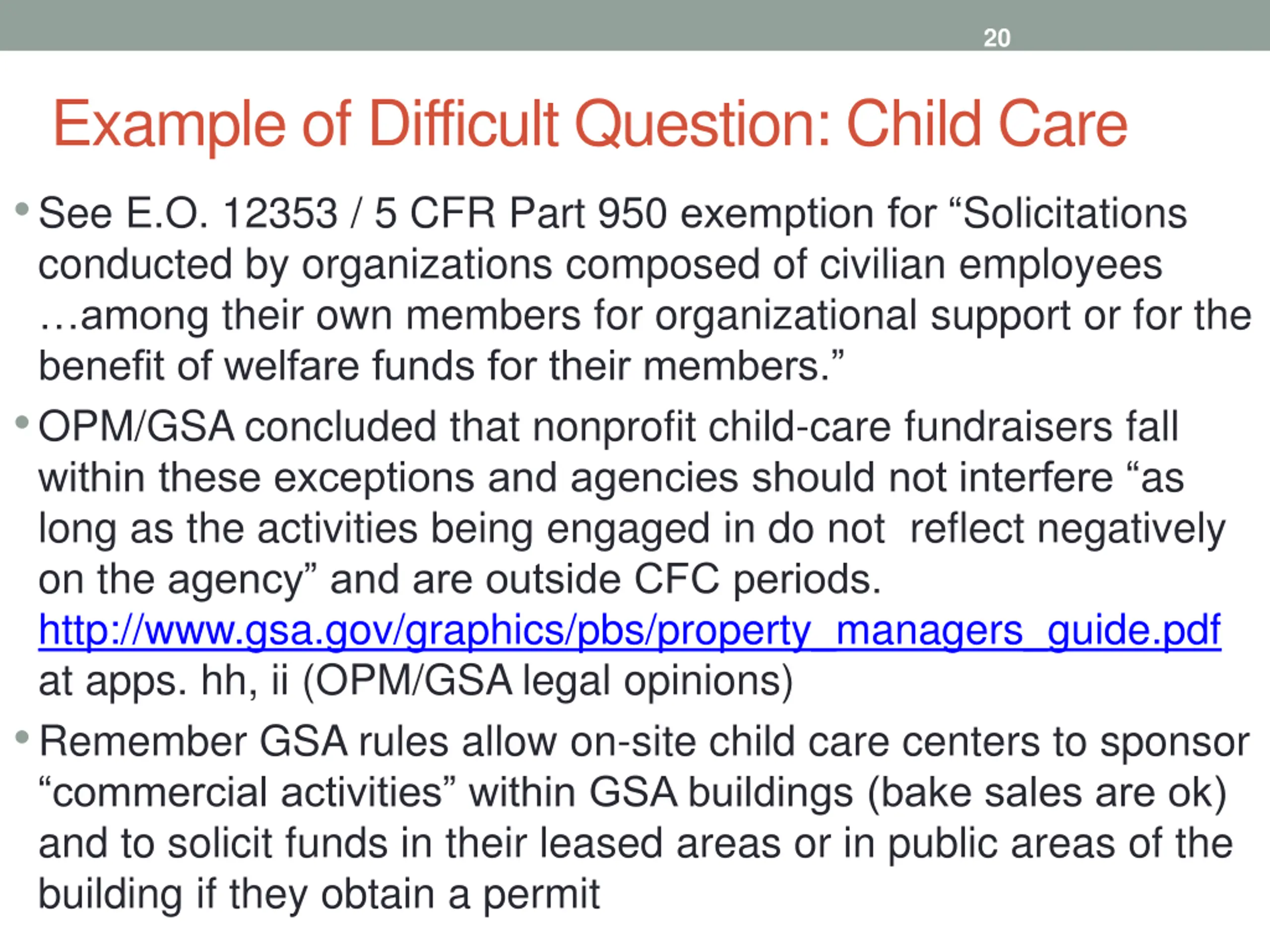19 Example of Difficult Question: Child Care An agency employee who is affiliated with the Board of the agency’s on-site child care center (usually a private nonprofit) asks if the center can solicit funds for its tuition assistance program within the federal building, outside of the center itself.
